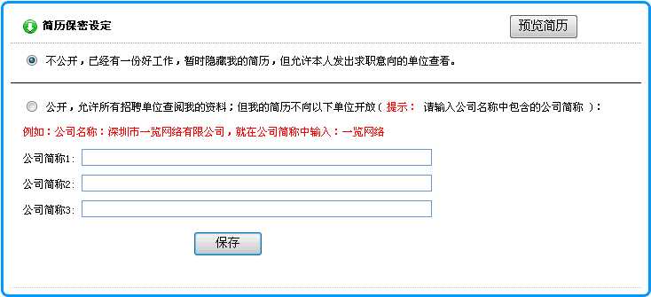 2)在打開(kāi)的頁(yè)面中,選擇 公開(kāi),允許所有招聘單位查閱我的資料;但我的簡(jiǎn)歷不向以下單位開(kāi)放( 提示: 請(qǐng)輸入公司名稱中包含的公司簡(jiǎn)稱 ):按下圖所示,對(duì)號(hào)入座填入信息,點(diǎn)擊保存按鈕即可.